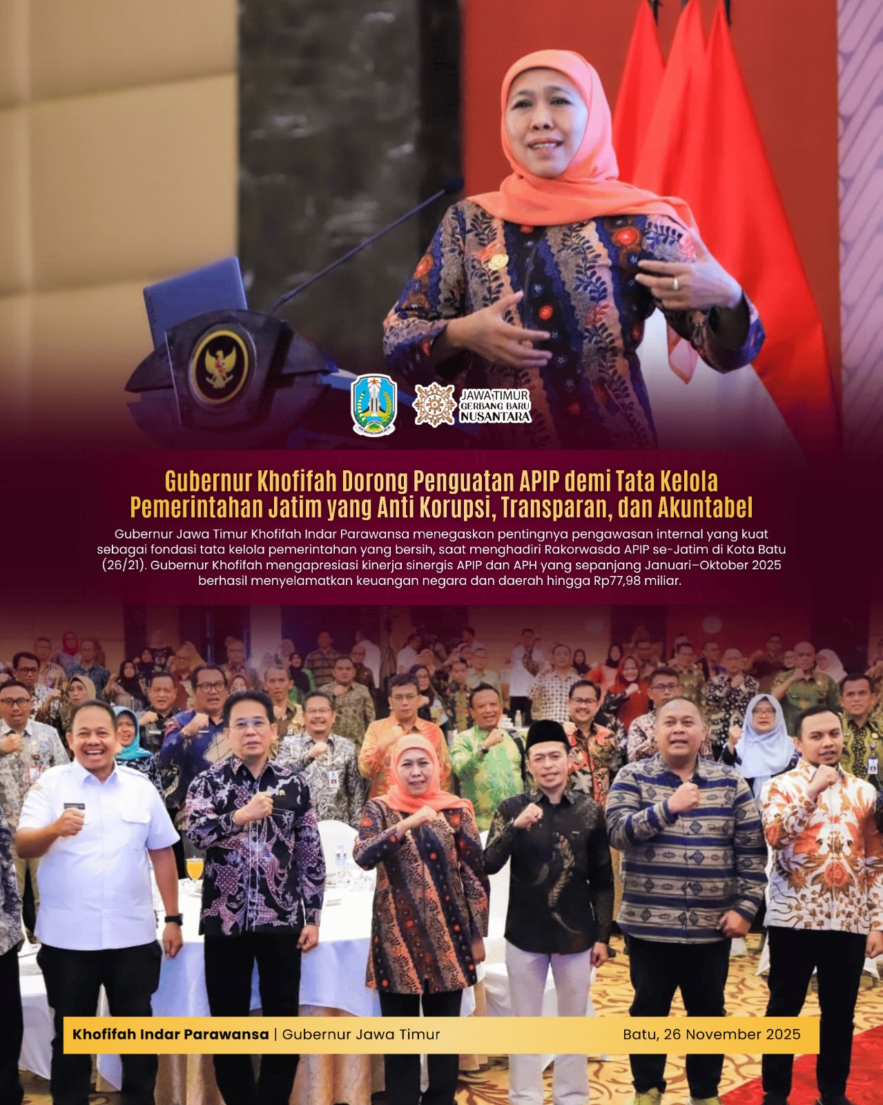 Gubernur Jawa Timur Khofifah Indar Parawansa terus mendorong Aparat Pengawas Internal (APIP) atau Inspektorat Daerah di Jawa Timur untuk meningkatkan efektivitas pengawasan sehingga tata kelola pemerintah lebih transparan dan akuntabel.