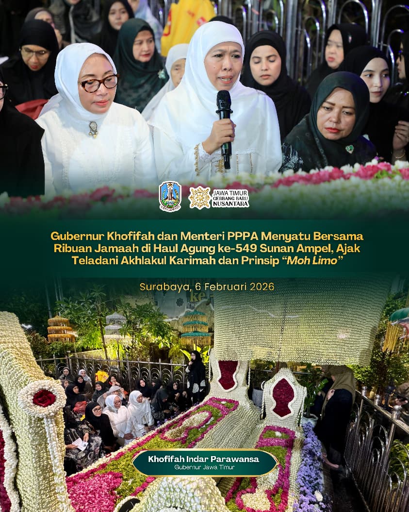 SURABAYA, 6 FEBRUARI 2026 – Gubernur Jawa Timur Khofifah Indar Parawansa bersama Menteri PPPA RI Arifatul Choiri Fauzi hadir dalam Haul Agung ke-549 Sunan Ampel di kawasan Makam Sunan Ampel Surabaya, Jumat (6/2) malam.