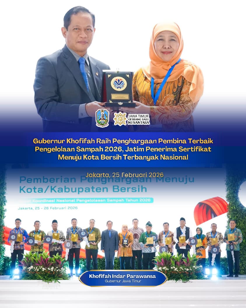 JAKARTA, 25 FEBRUARI 2026 – Provinsi Jawa Timur kembali menerima penghargaan bergengsi nasional dalam pengelolaan sampah yang digelar oleh Kementerian Lingkungan Hidup / Badan Pengendalian Lingkungan Hidup RI. Gubernur Jawa Timur Khofifah Indar Parawansa menerima Penghargaan Kinerja Pengelolaan Sampah 2026 sebagai Pembina Terbaik Kabupaten/Kota.