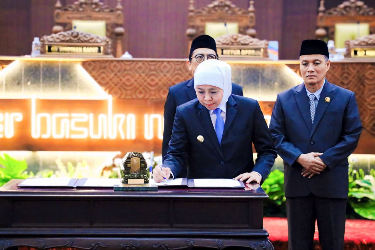 SURABAYA, 20  JANUARI 2026 – Gubernur Jawa Timur Khofifah Indar Parawansa bersama Pimpinan DPRD Jatim resmi mengesahkan dua Peraturan Daerah (Perda) strategis dalam Rapat Paripurna di Gedung DPRD Provinsi Jawa Timur, Senin (19/1).