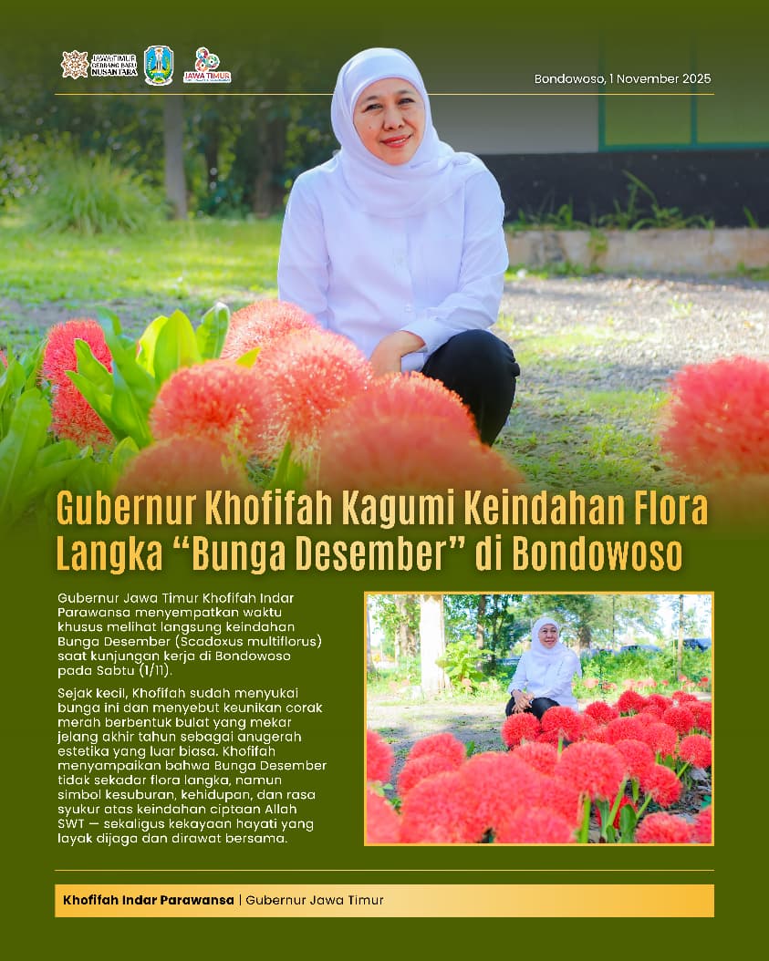 Gubernur Jawa Timur Khofifah Indar Parawansa menyempatkan waktu untuk melihat langsung flora langka bernama “Bunga Desember” atau Scadoxus multiflorus di Pekarangan Rumah Dinas Asisten Perhutani (Asper) Bagian Kesatuan Pengelolaan Hutan (BKPH) Klabang, Bondowoso, Sabtu (1/11).