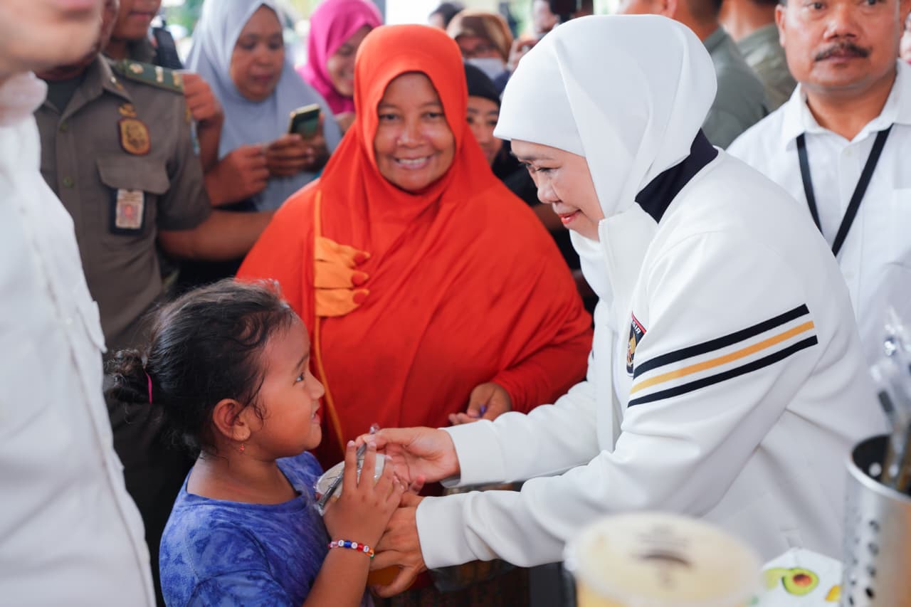 Gubernur Jatim Khofifah Indar Parawansa menegaskan komitmen Pemprov Jatim menggelar pasar murah. Ia ingin sembako murah bisa diakses seluruh warga termasuk di wilayah perbatasan.