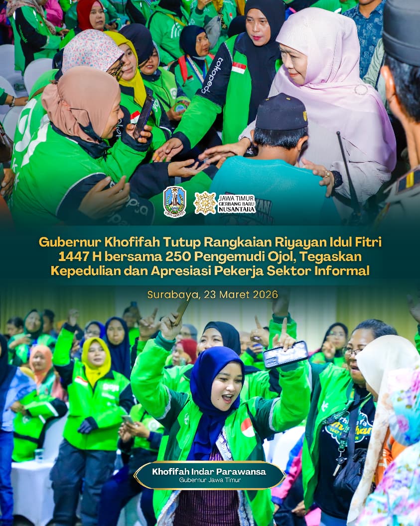 SURABAYA, 24 MARET 2026 – Gubernur Jawa Timur Khofifah Indar Parawansa mengakhiri rangkaian riyayan Idul Fitri 1447 H dengan bersilaturahim dengan 250 pengemudi ojek online (ojol) di kediaman Jemursari Surabaya, Senin (23/3). Hal ini sebagai wujud kepedulian dan apresiasi terhadap para pekerja sektor informal.