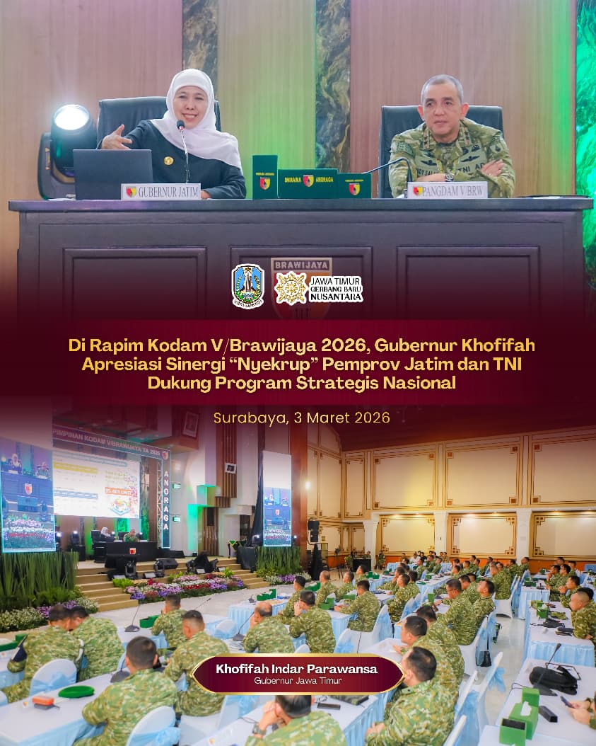 SURABAYA, 4 MARET 2026 – Gubernur Jawa Timur Khofifah Indar Parawansa menegaskan bahwa sinergi dan kolaborasi yang ‘nyekrup’ antara Pemerintah Provinsi Jawa Timur dan Kodam V/Brawijaya menjadi fondasi utama dalam menjaga efektivitas pembangunan serta keberhasilan pelaksanaan program strategis nasional di  Jawa Timur.