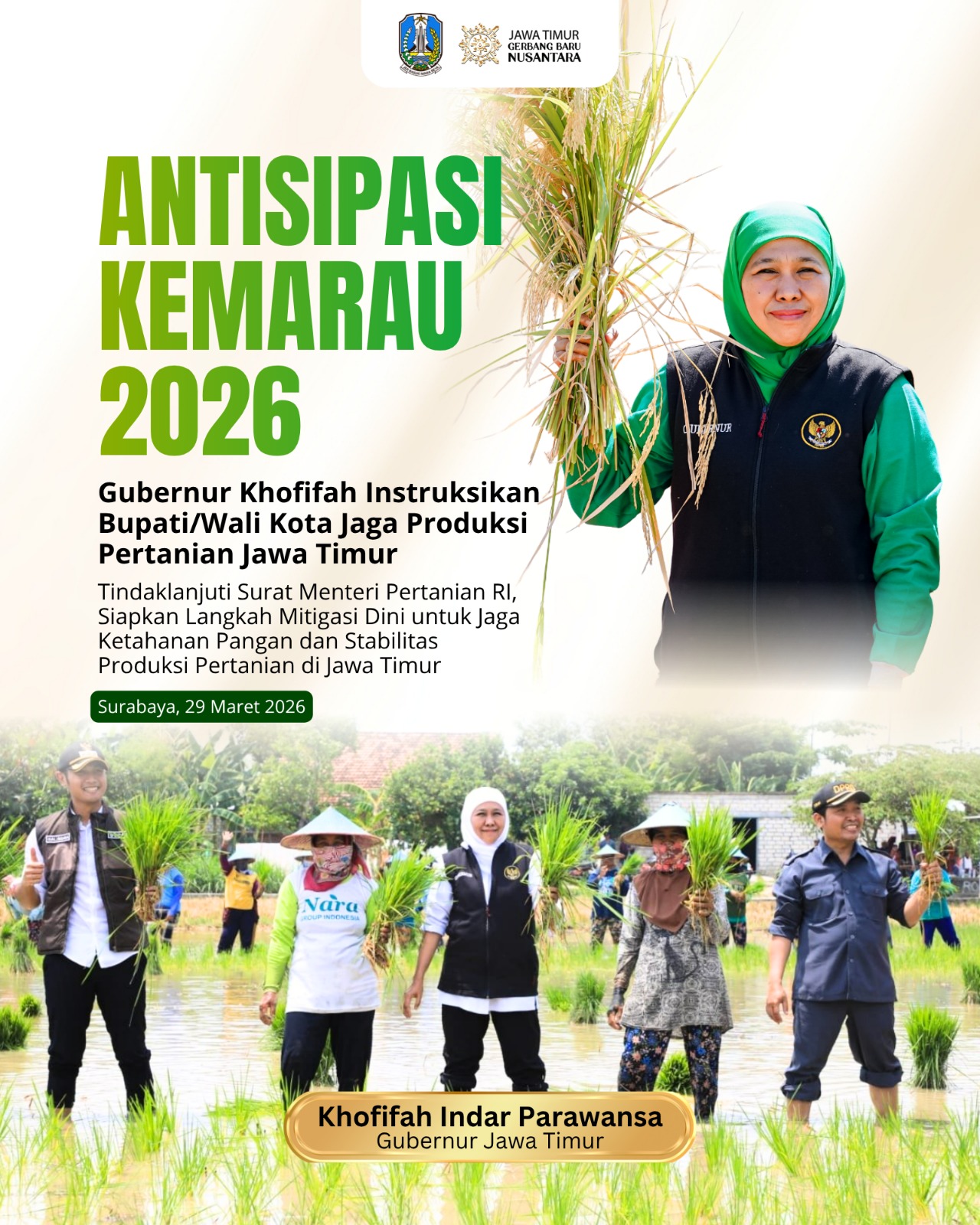 SURABAYA, 2 April  2026 – Gubernur Jawa Timur Khofifah Indar Parawansa menginstruksikan seluruh Bupati dan Walikota se-Jawa Timur untuk memperkuat langkah strategis dalam mengantisipasi dampak musim kemarau tahun 2026 terhadap produksi pertanian.
