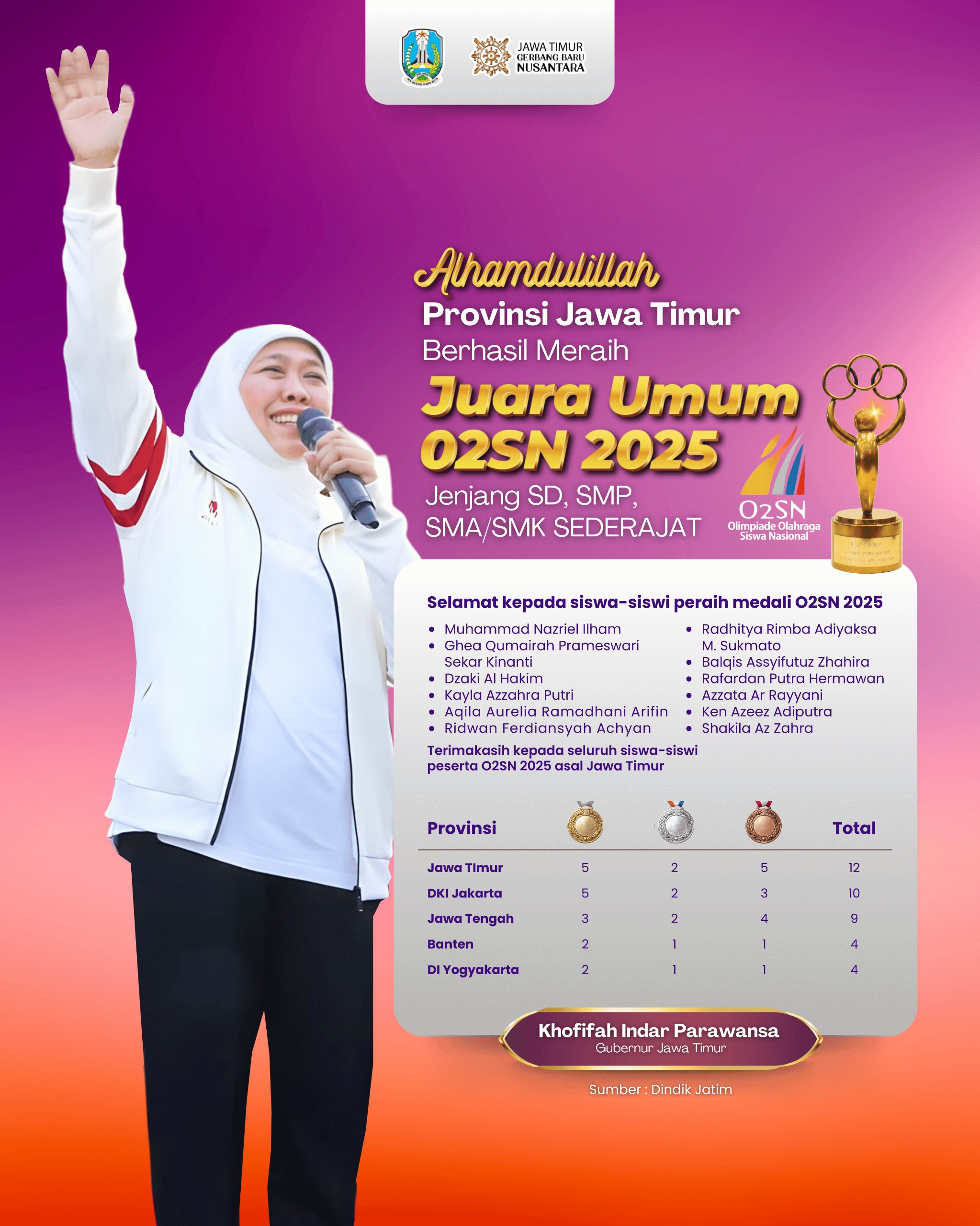 “Alhamdulillah, Jatim kembali menorehkan prestasi gemilang. Perolehan sebagai Juara Umum O2SN 2025 ini merupakan bukti kerja keras, kedisiplinan, serta semangat juang para siswa kita.  Hal ini sekaligus menunjukkan bahwa pembinaan olahraga di Jatim berjalan sangat baik dan kompetitif,” ujar Gubernur Khofifah di Surabaya, Minggu  (23/11).
