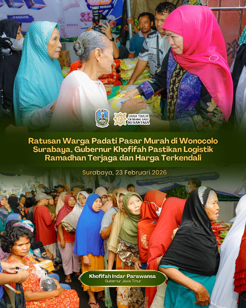 SURABAYA, 24 FEBRUARI 2026 – Gubernur Jawa Timur Khofifah Indar Parawansa terus mengintensifkan pelaksanaan Pasar Murah selama Bulan Suci Ramadhan sebagai langkah strategis menjaga stabilitas harga dan daya beli masyarakat. Kali ini, Pasar Murah ke-25 digelar di halaman Masjid At-Taqwa, Jemur Wonosari, Kecamatan Wonocolo, Surabaya, Senin (23/2).