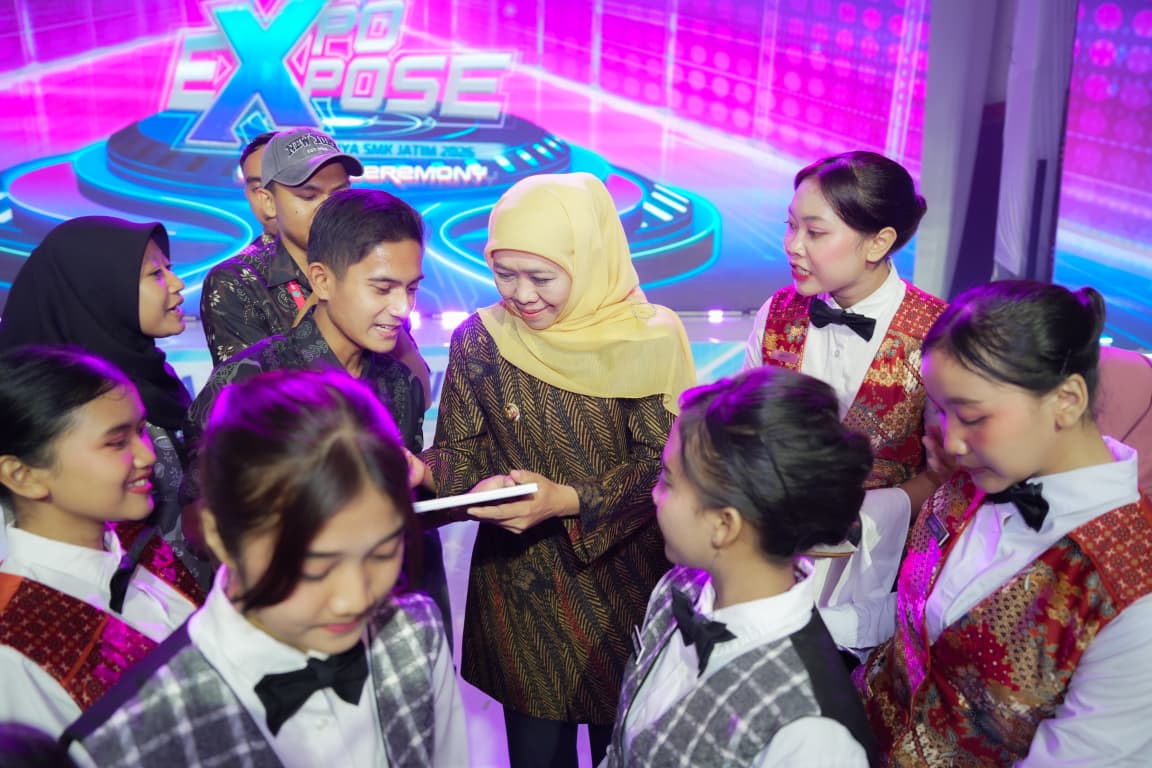 SURABAYA, 15 FEBRUARI 2026 – Gubernur Jawa Timur Khofifah Indar Parawansa melakukan pencanangan gerakan bebas sampah plastik di lingkungan sekolah yang digelar di sela Expo dan Expose Hebatnya SMK Jatim, di Grand City, Sabtu (14/2).