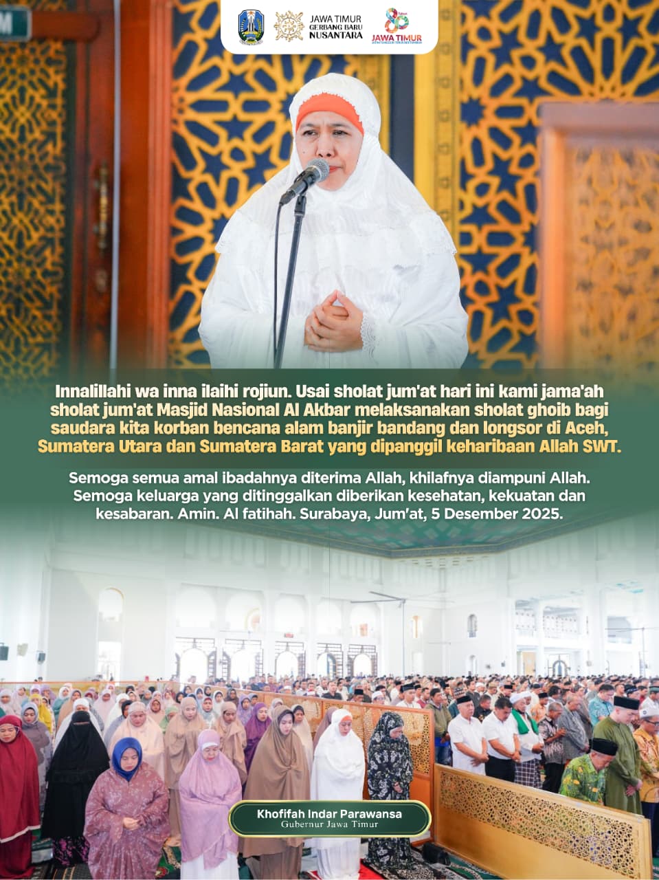 SURABAYA, 5 DESEMBER 2025 – Gubernur Jawa Timur Khofifah Indar Parawansa bersama ribuan masyarakat Jawa Timur melakukan Sholat Ghaib untuk seluruh korban meninggal akibat bencana banjir bandang dan longsor yang melanda beberapa wilayah Aceh, Sumatera Utara dan Sumatera Barat.