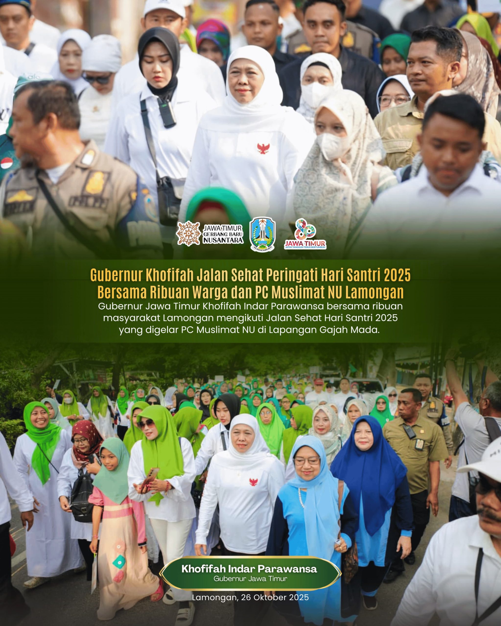Kegiatan ini diselenggarakan oleh PC NU dan PC Muslimat NU Kabupaten Lamongan sebagai bagian dari rangkaian peringatan Hari Santri Nasional (HSN) 2025, yang berlangsung meriah, penuh semangat, dan diikuti antusiasme yang tinggi masyarakat dari berbagai kecamatan.