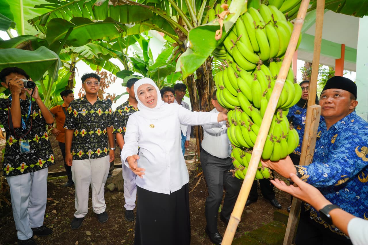 Dalam peninjauannya itu, Gubernur Khofifah turut memanen hasil produksi berupa sayur pakcoy, ikan lele, hingga pisang cavendish yang dibudidayakan langsung di area sekolah. Pada kesempatan yang sama, Khofifah juga menanam pohon alpukat di halaman sekolah sebagai simbol komitmen bersama dalam menjaga ketahanan pangan dan kelestarian lingkungan.