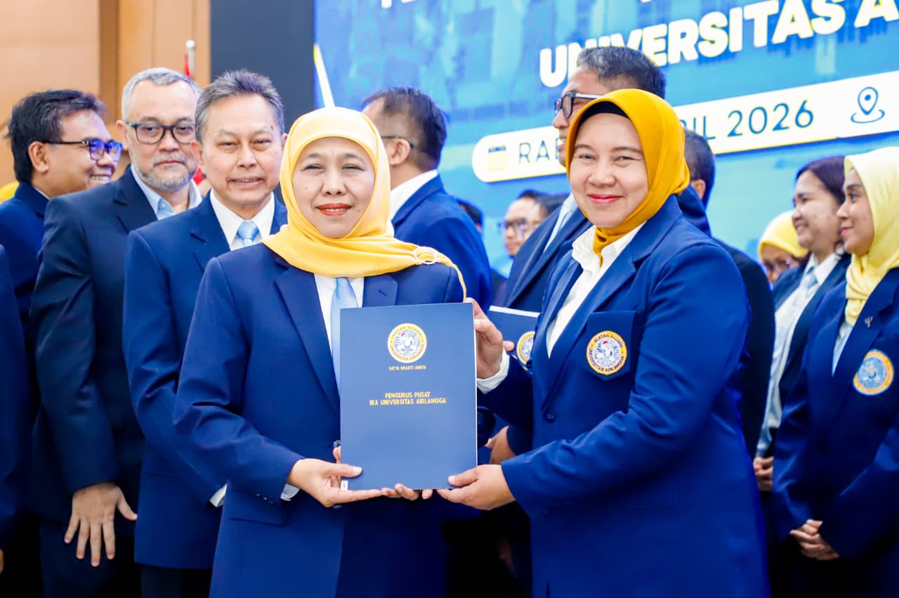 SURABAYA, 9 APRIL 2026 – Ketua Umum PP IKA Universitas Airlangga (UNAIR) yang juga Gubernur Jawa Timur melantik Pengurus Wilayah, Komisariat, dan Pengurus Cabang IKA UNAIR periode 2025–2030 di Plaza Airlangga Surabaya, Rabu (8/4) malam, sekaligus mendorong peran strategis alumni dalam menyatukan keilmuan dan pengabdian profesional guna mempercepat pembangunan di berbagai sektor.