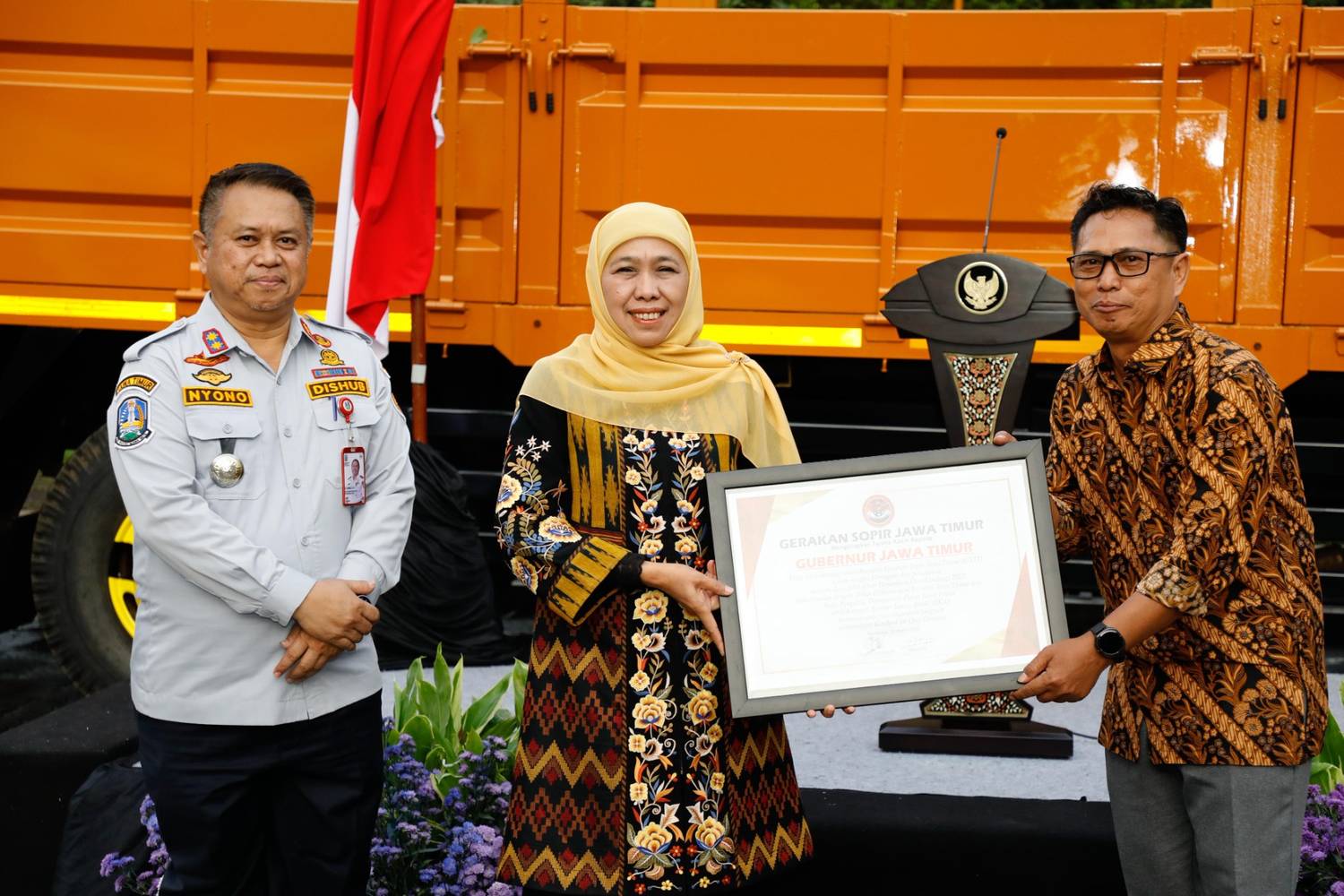 SURABAYA, 6 MARET 2026 – Gubernur Jawa Timur Khofifah Indar Parawansa menyerahkan truk yang telah dinormalisasi dimensinya kepada perwakilan sopir di halaman Kantor Dinas Perhubungan (Dishub) Provinsi Jawa Timur, Jumat (6/3).