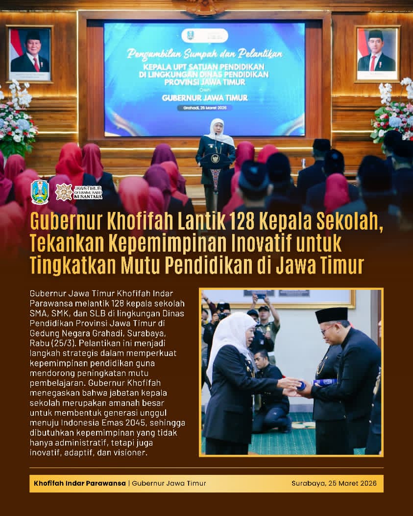 Lebih jauh, Khofifah menegaskan bahwa Pemerintah Provinsi Jawa Timur terus memperkuat pembinaan manajemen pendidikan melalui penataan, mutasi, dan promosi kepala sekolah secara terencana dan terukur.