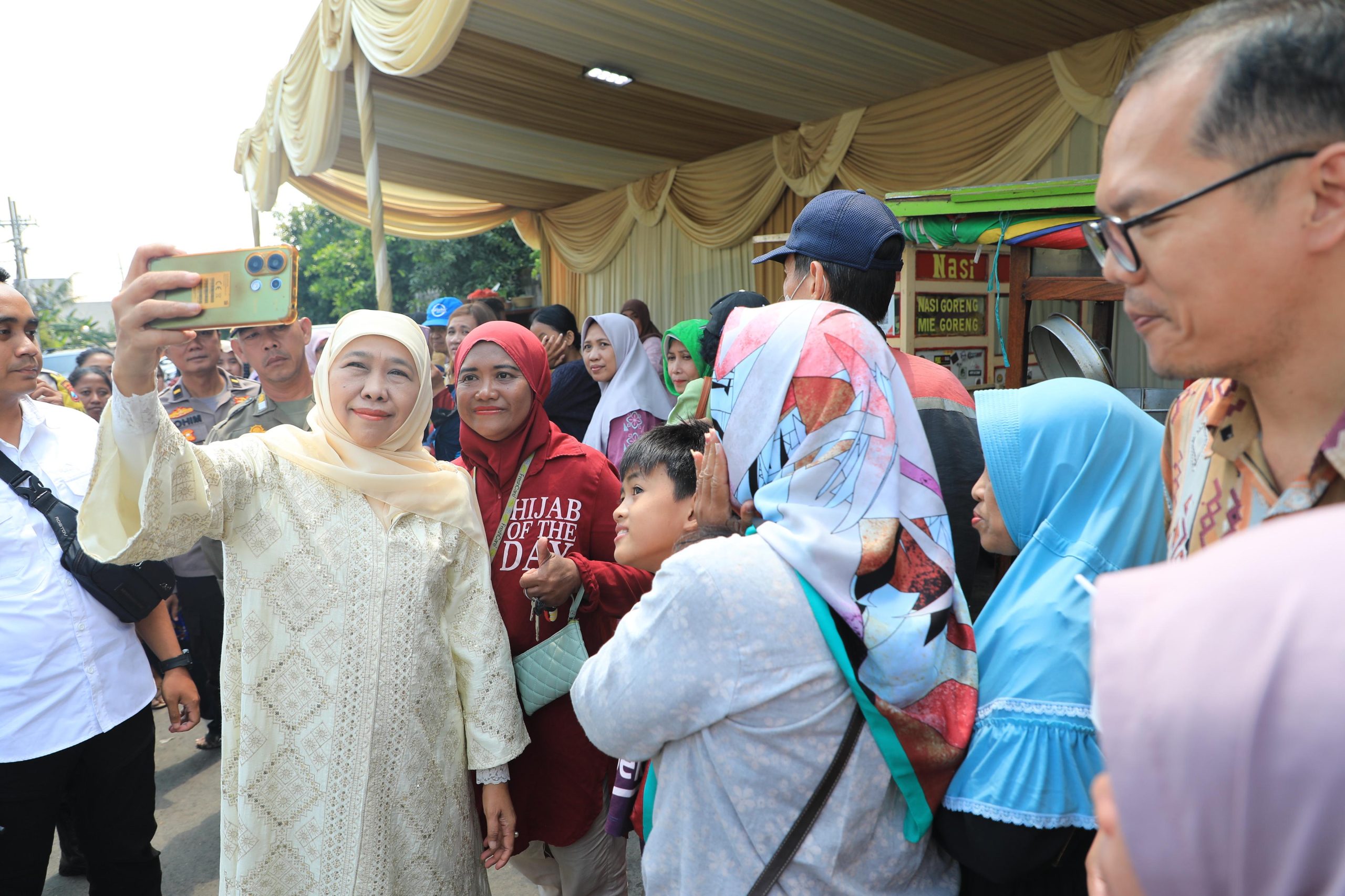 Dengan penuh keramahan, Gubernur Khofifah menyapa satu per satu warga yang hadir. Ia juga melayani permintaan swafoto sebagai bentuk kedekatan dengan masyarakat yang ingin mengabadikan momen kebersamaan tersebut.